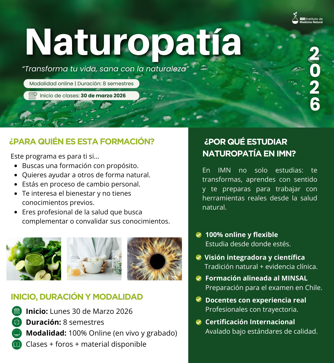 ¡Claro que sí! IMN cuenta con una certificación internacional de estudio de la carrera de Naturopatía además de una modalidad 100% online para que puedas conectarte y visualizar las clases desde cualquier parte del mundo.